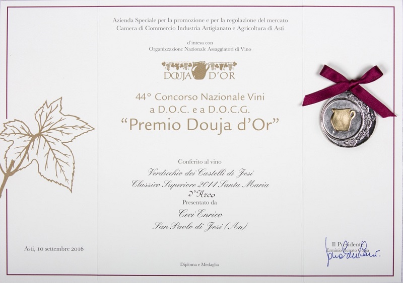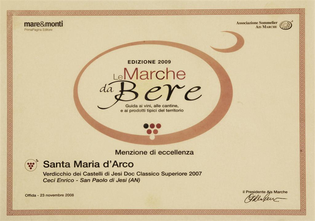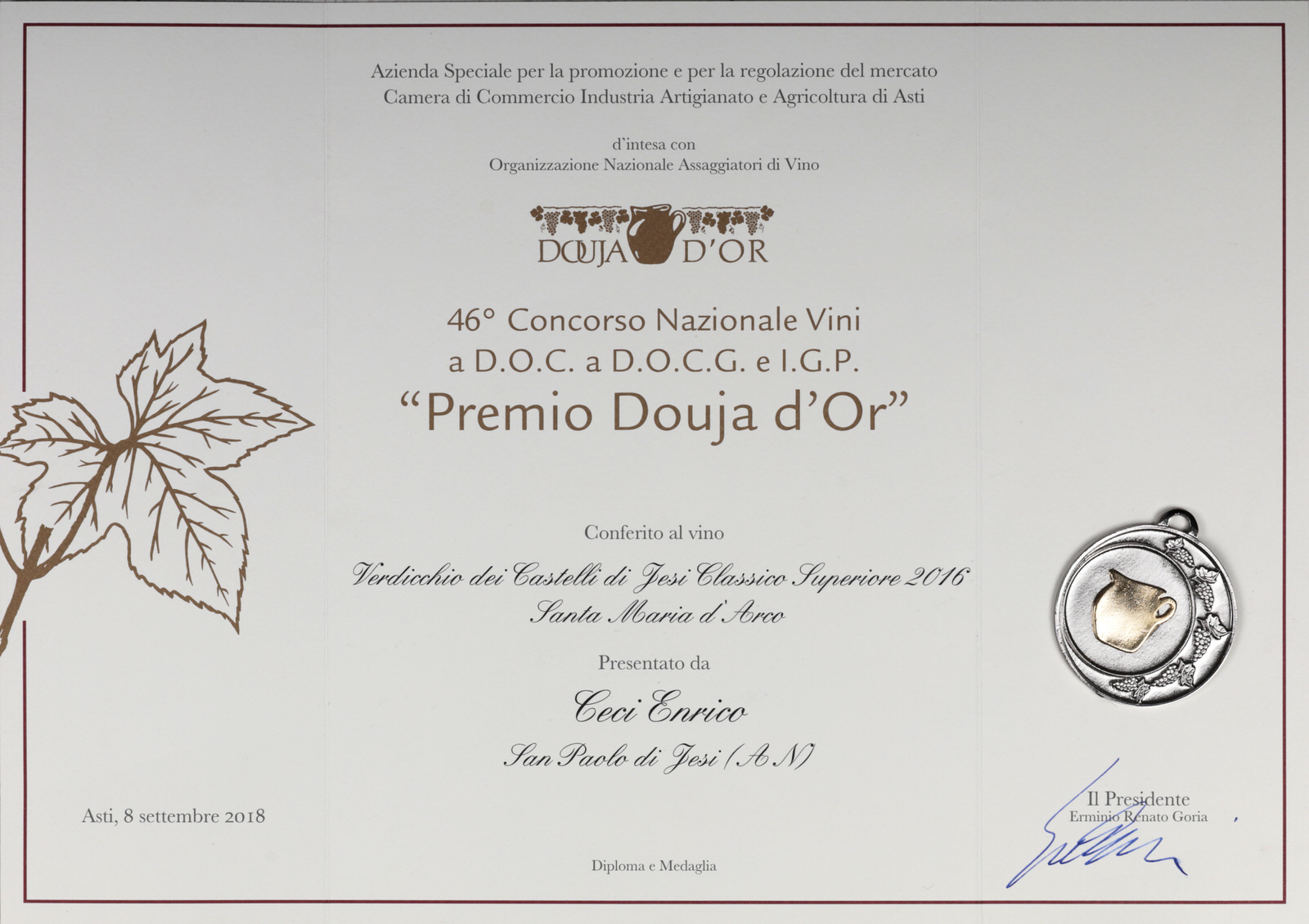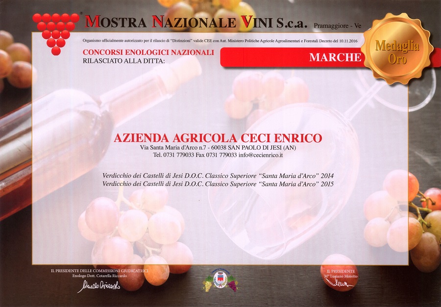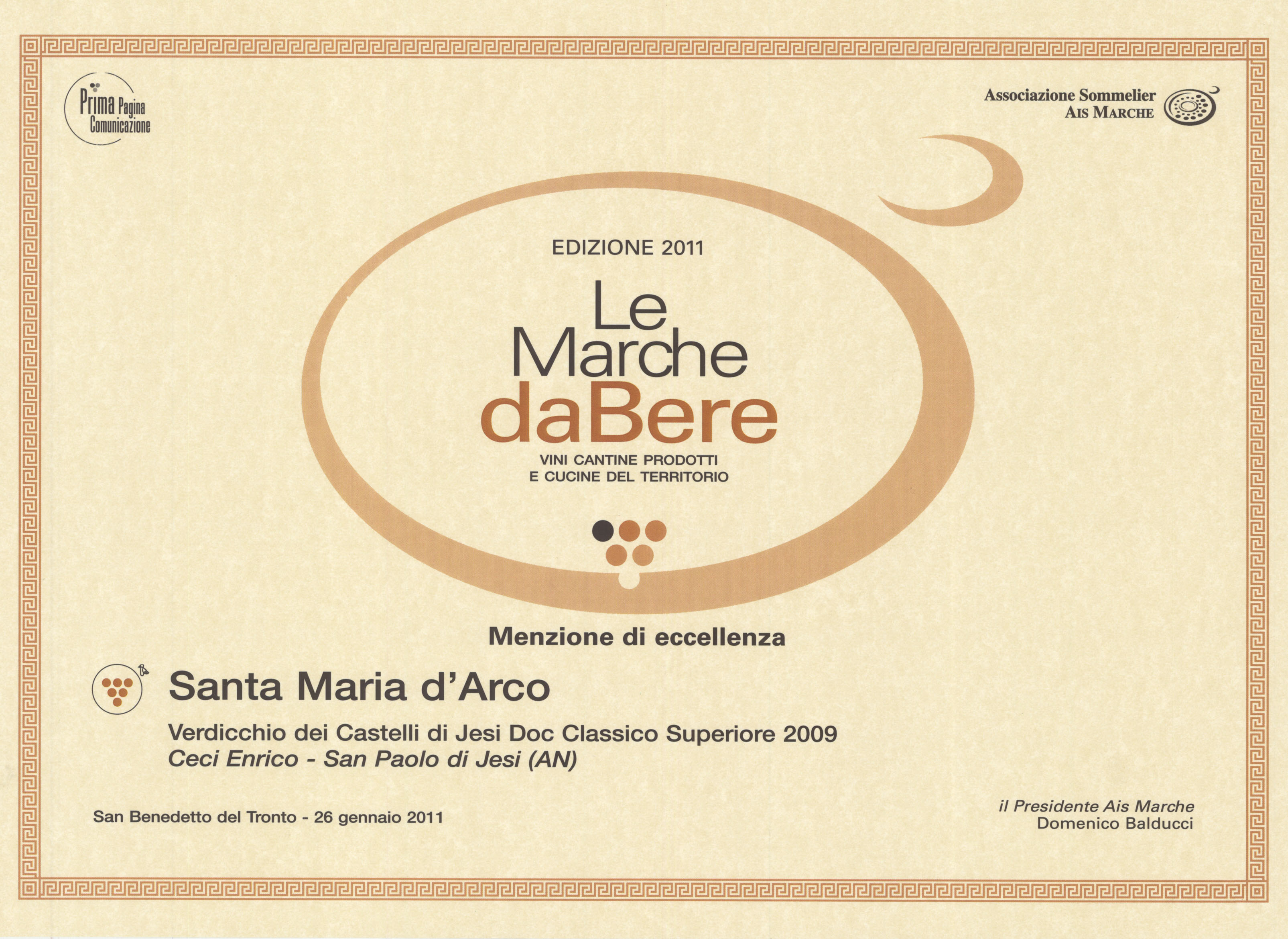 - Superficie totale vigneti: circa 9 ettari; di cui circa 1,8 destinati al Verdicchio dei Castelli di Jesi Classico Superiore “Santa Maria d’Arco”;